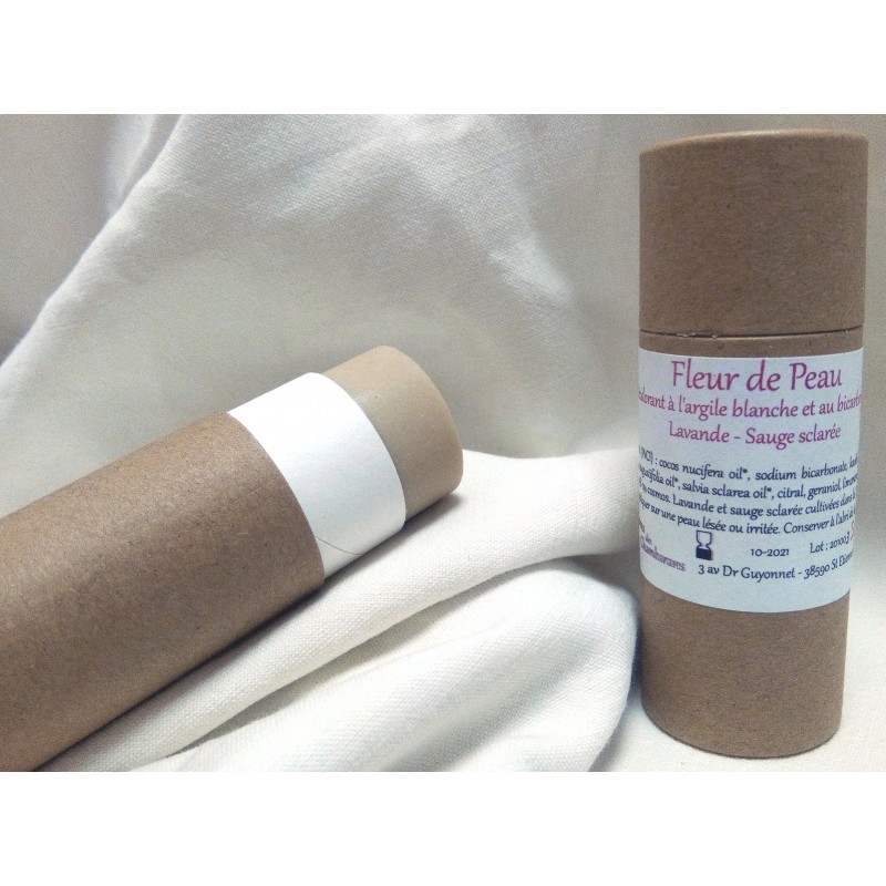 Déodorant aux senteurs florales délicates. Lavande apaisante et sauge sclarée cultivées et distillées dans la Dröme, limitant la prolifération bactérienne et donc les odeurs. Emballage entièrement compostable (carton et amidon de maïs)