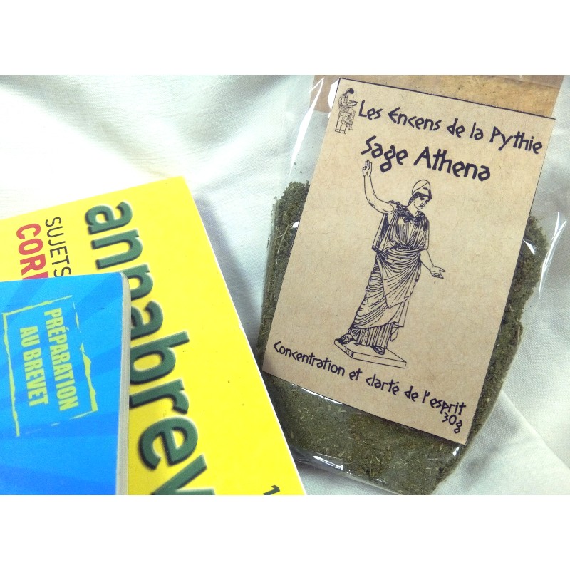 Nous avons placé ce mélange, destiné à clarifier le mental et aider à la concentration, sous le patronage d'Athéna. Dominé par les éléments eau et air, par la fraîcheur de la menthe, cet encens accompagnera à merveilles révisions et examens.